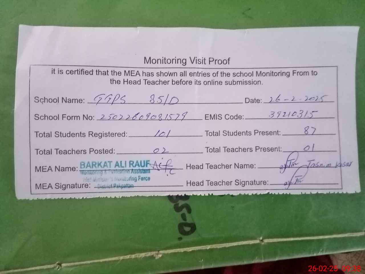 | Attendance Register | Head Teacher | MEA with School | Visit Proof |