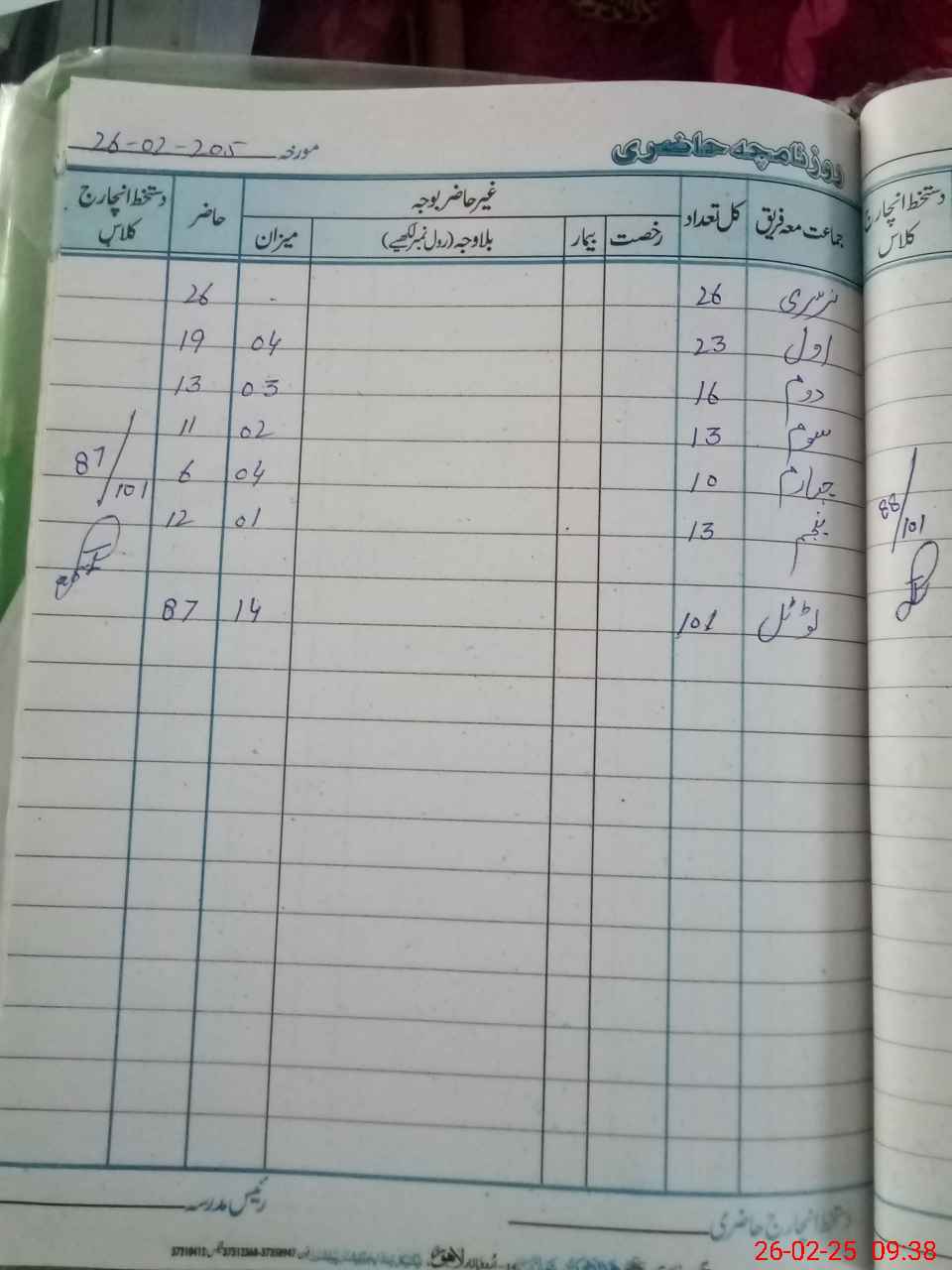 | Total Students Present | 0 | 0 | 26 | 19 | 13 | 11 | 6 | 12 | 87 | |||||||