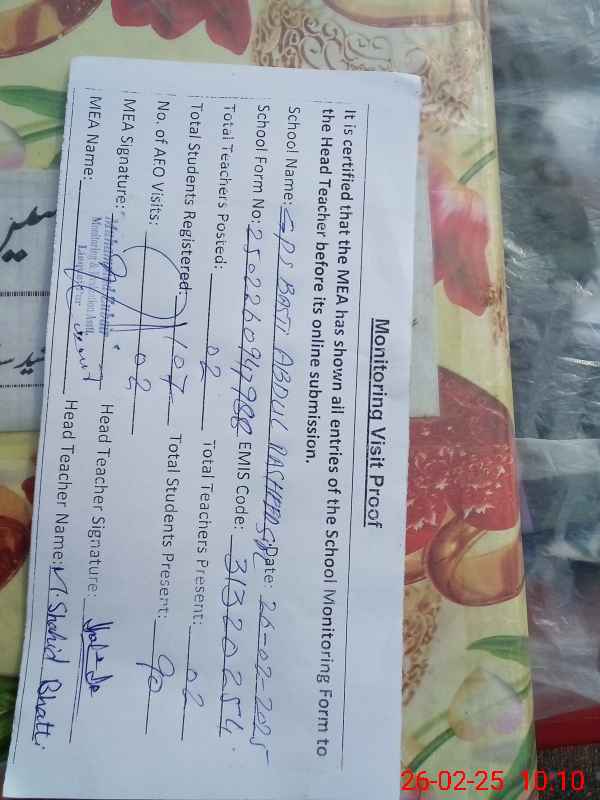 | EMIS Code: 31320254 | Name of School: GPS BASTI ABDUL RASHEED SIAL | |||