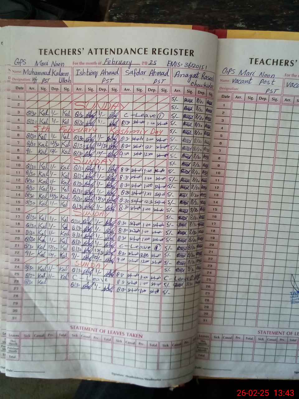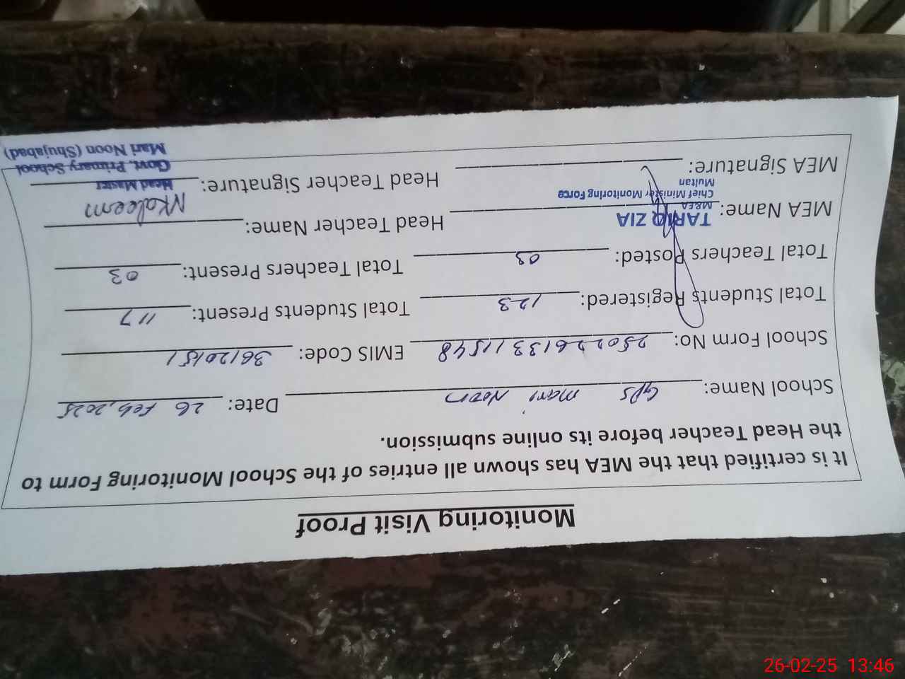 | EMIS Code: 36120151 | Name of School: GPS MARI NOON TAIL FAIZ PUR | |||