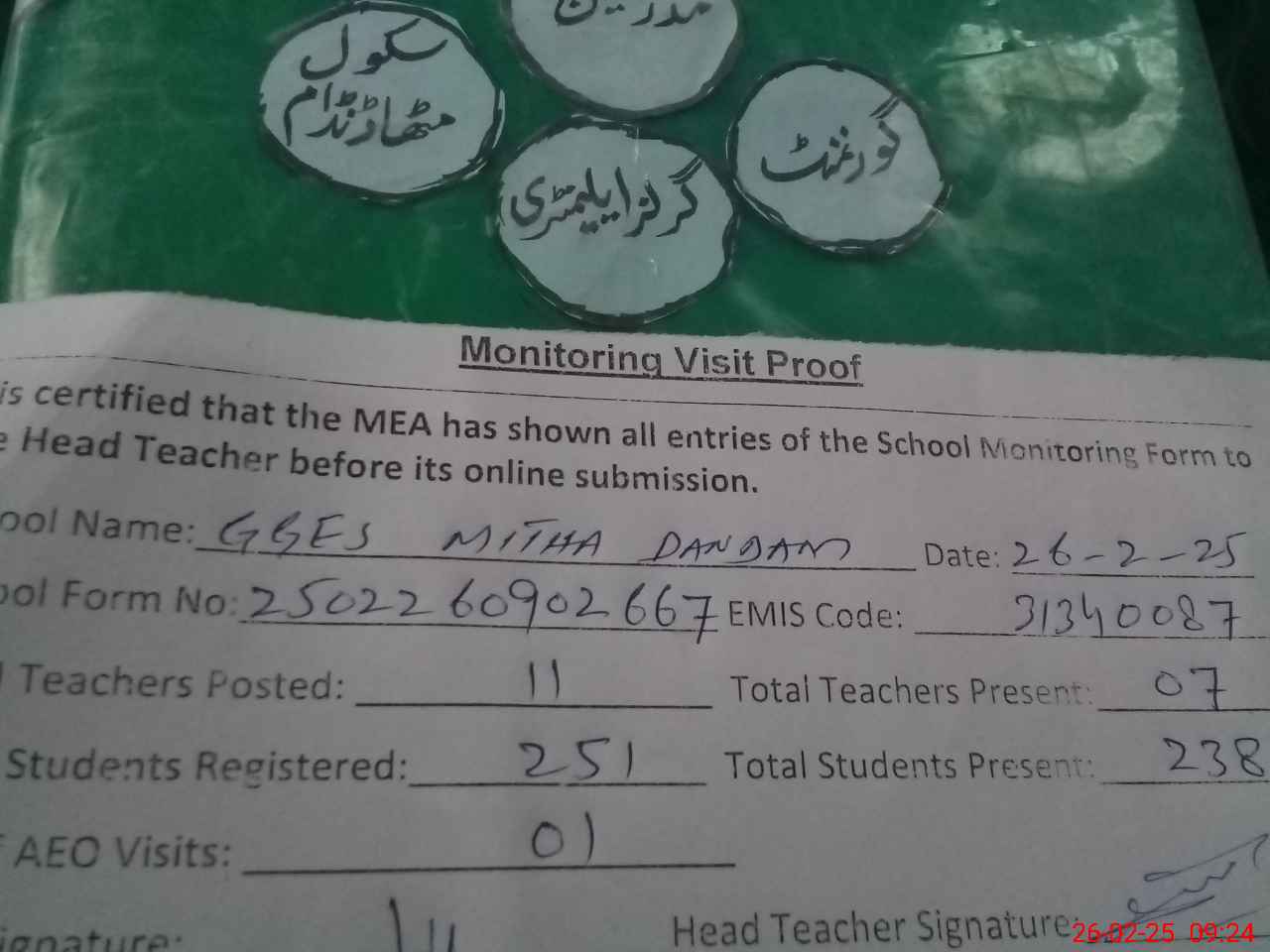 | Certified that this School was Inspected by the Undersigned MEA/DMO Today and the Information Stated Above is as Per Record. | |||||