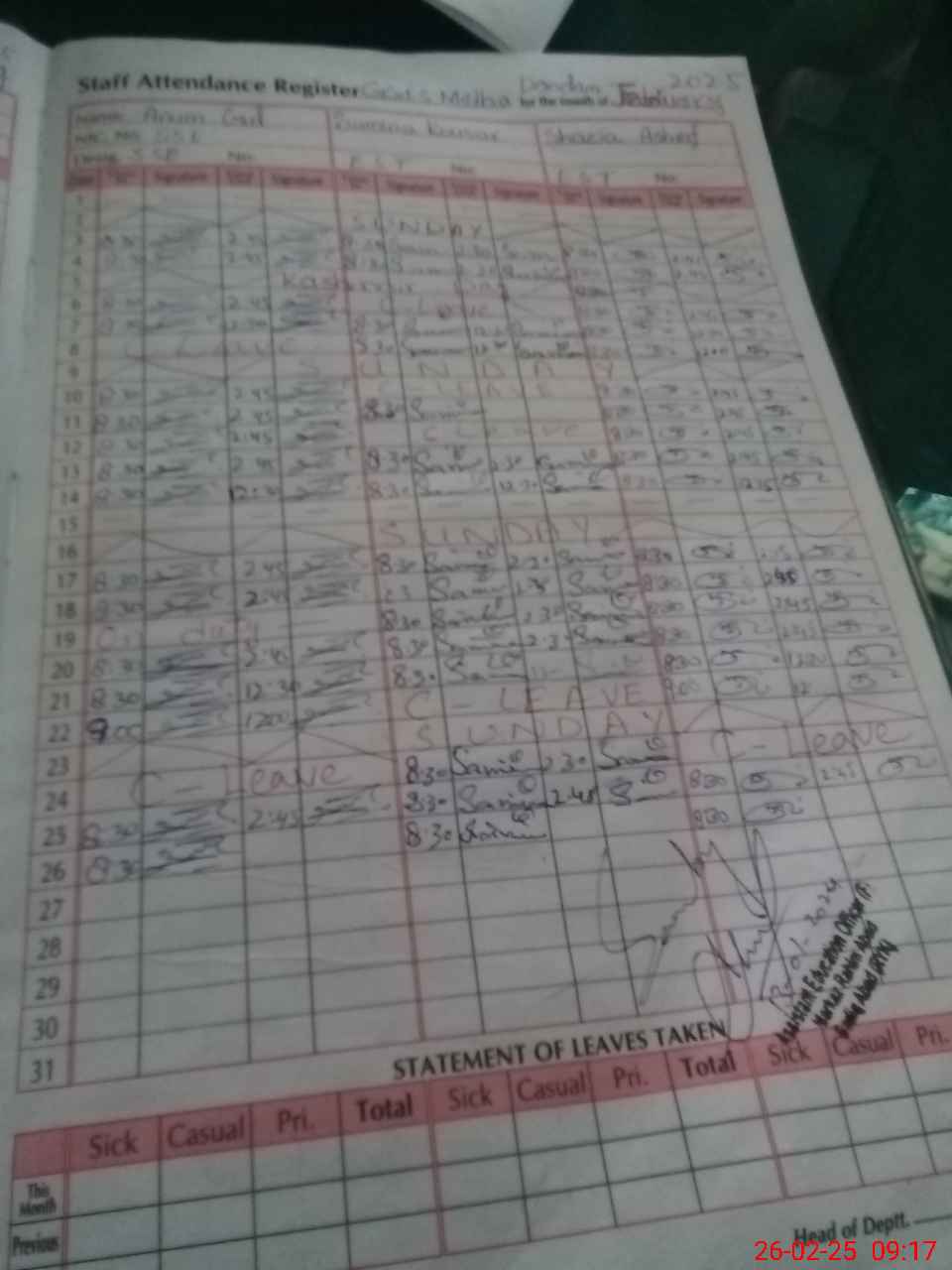 | CNIC | Full Name | Designation | R/C | Absence during last cal. month |
