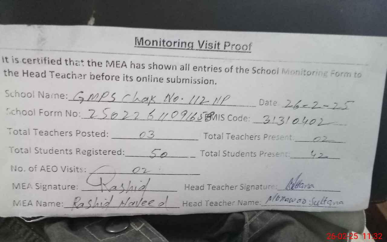 | EMIS Code: 31310402 | Name of School: GMPS CHAK NO. 112/NP BASTI DIN MUHAMMAD | |||