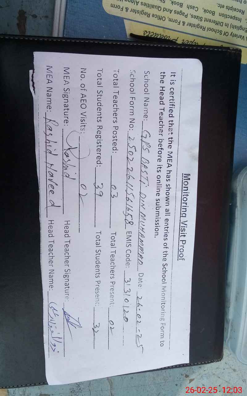 | Certified that this School was Inspected by the Undersigned MEA/DMO Today and the Information Stated Above is as Per Record. | |||||