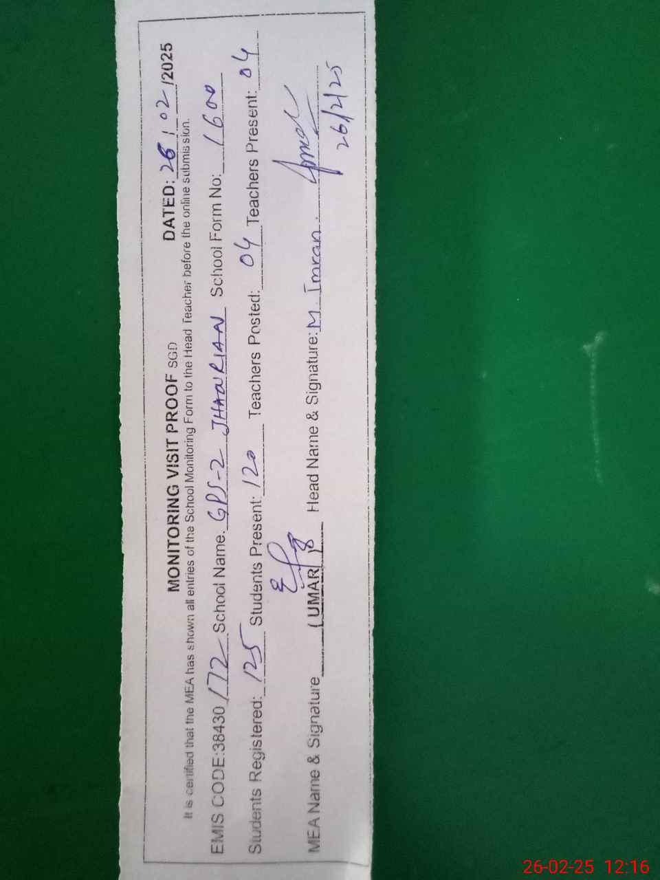 | Attendance Register | Head Teacher | MEA with School | Visit Proof |