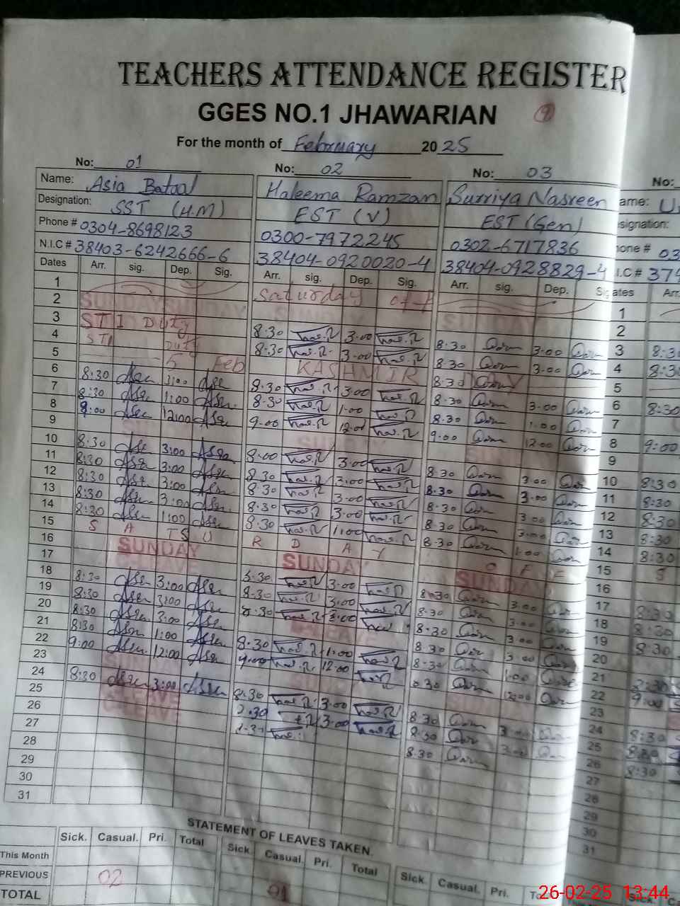 | CNIC | Full Name | Designation | R/C | Absence During Last Calender Month |