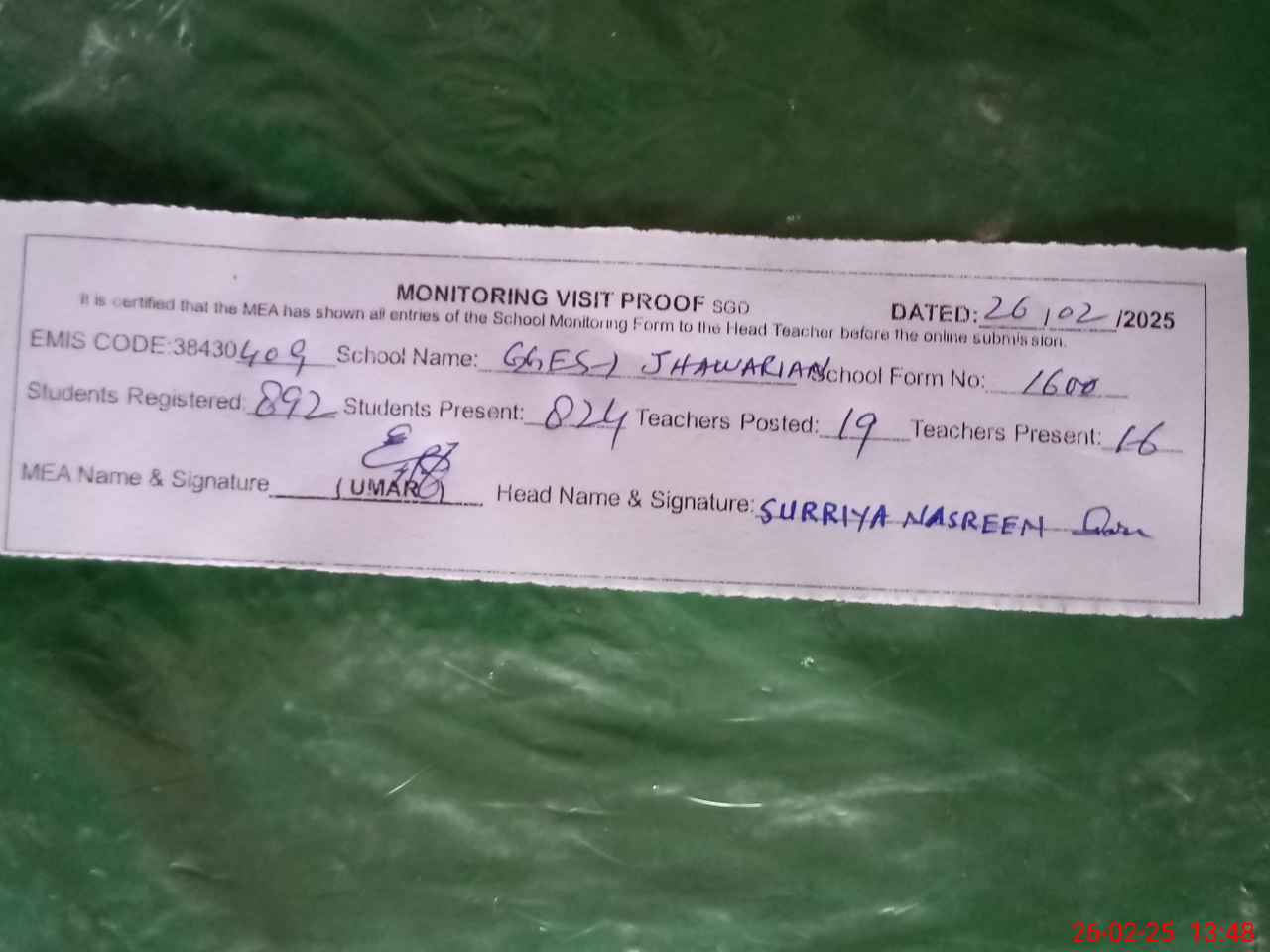 | Certified that this School was Inspected by the Undersigned MEA/DMO Today and the Information Stated Above is as Per Record. | |||||