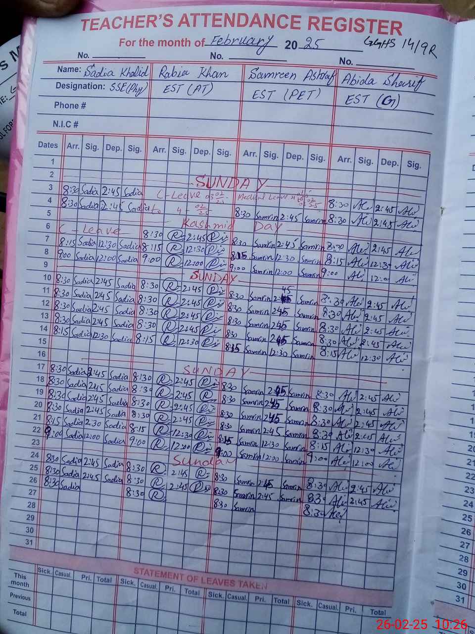 | Remarks (Use Separate Page if Required): 10 class free for final exam attendance taken from roznamcha School all data filled again previous not sended due to location fatched | |||||