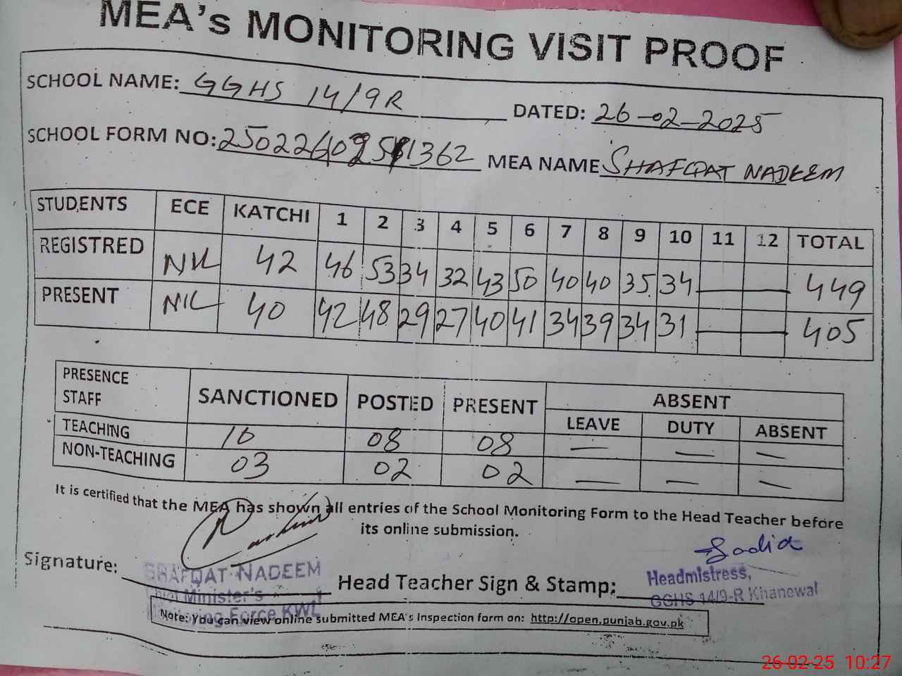 | Attendance Register | Head Teacher | MEA with School | Visit Proof |