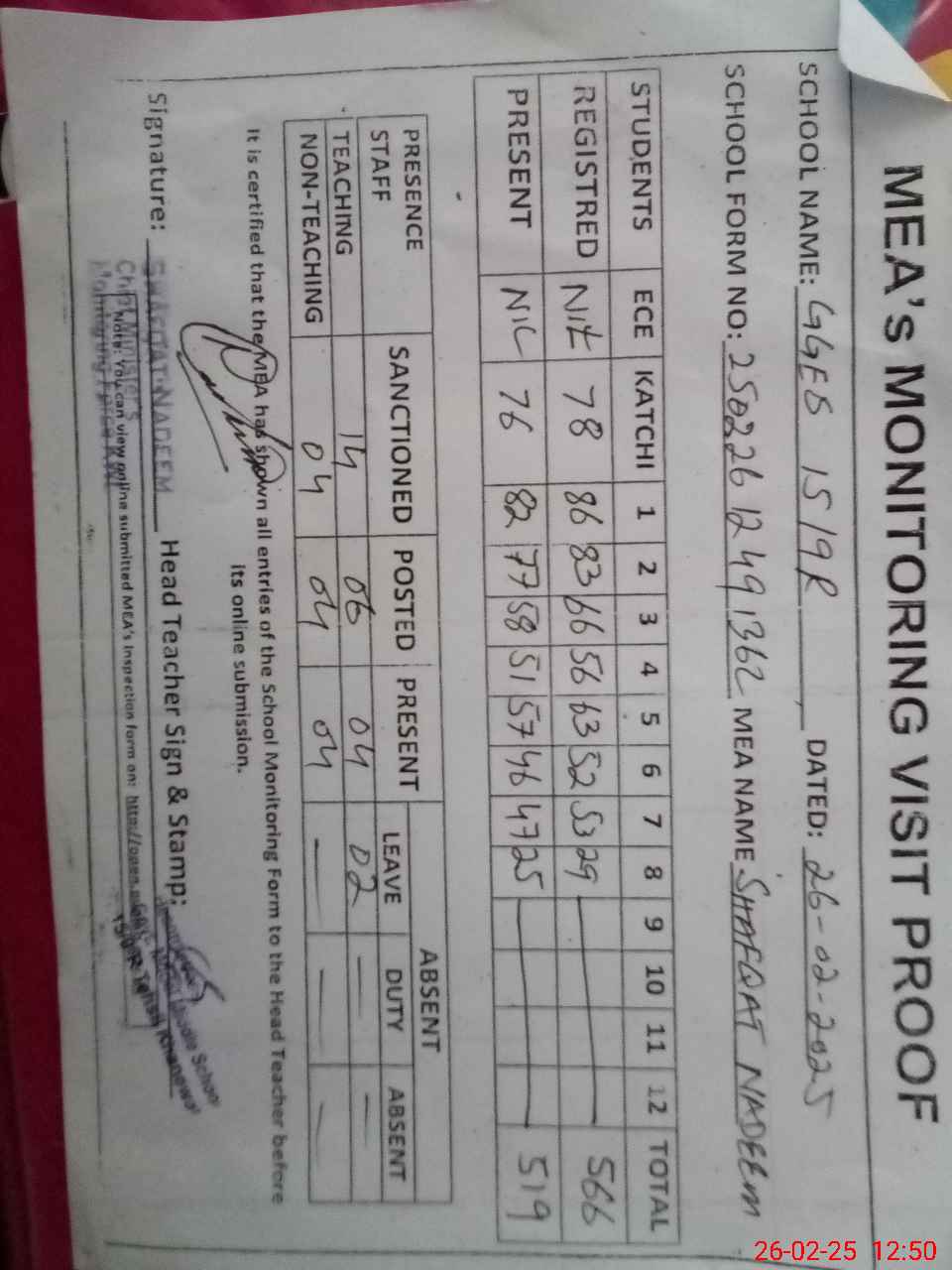 | Attendance Register | Head Teacher | MEA with School | Visit Proof |