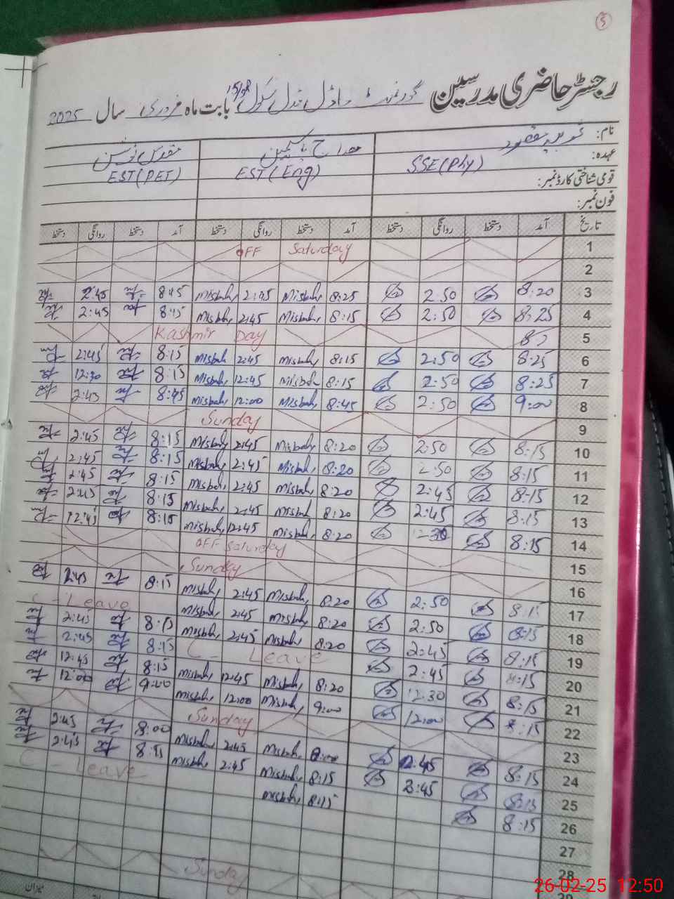 | CNIC | Full Name | Designation | R/C | Absence During Last Calender Month |