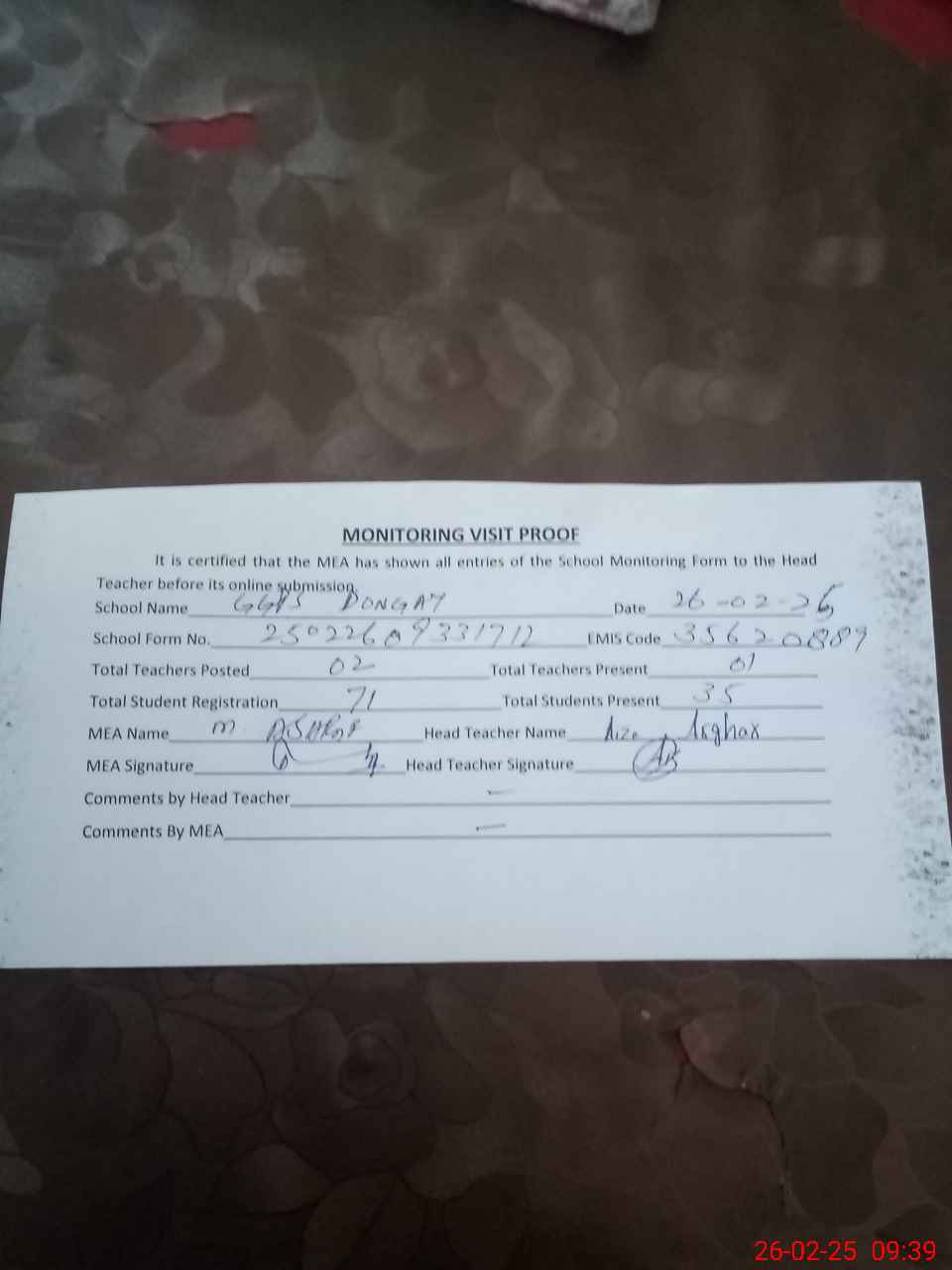 | Attendance Register | Head Teacher | MEA with School | Visit Proof |