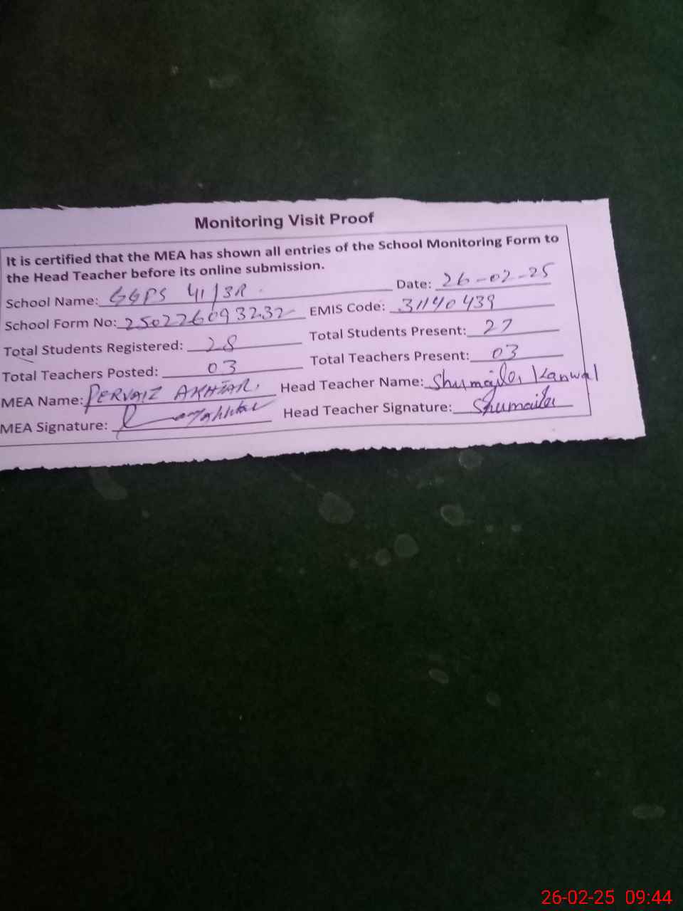 | Attendance Register | Head Teacher | MEA with School | Visit Proof |