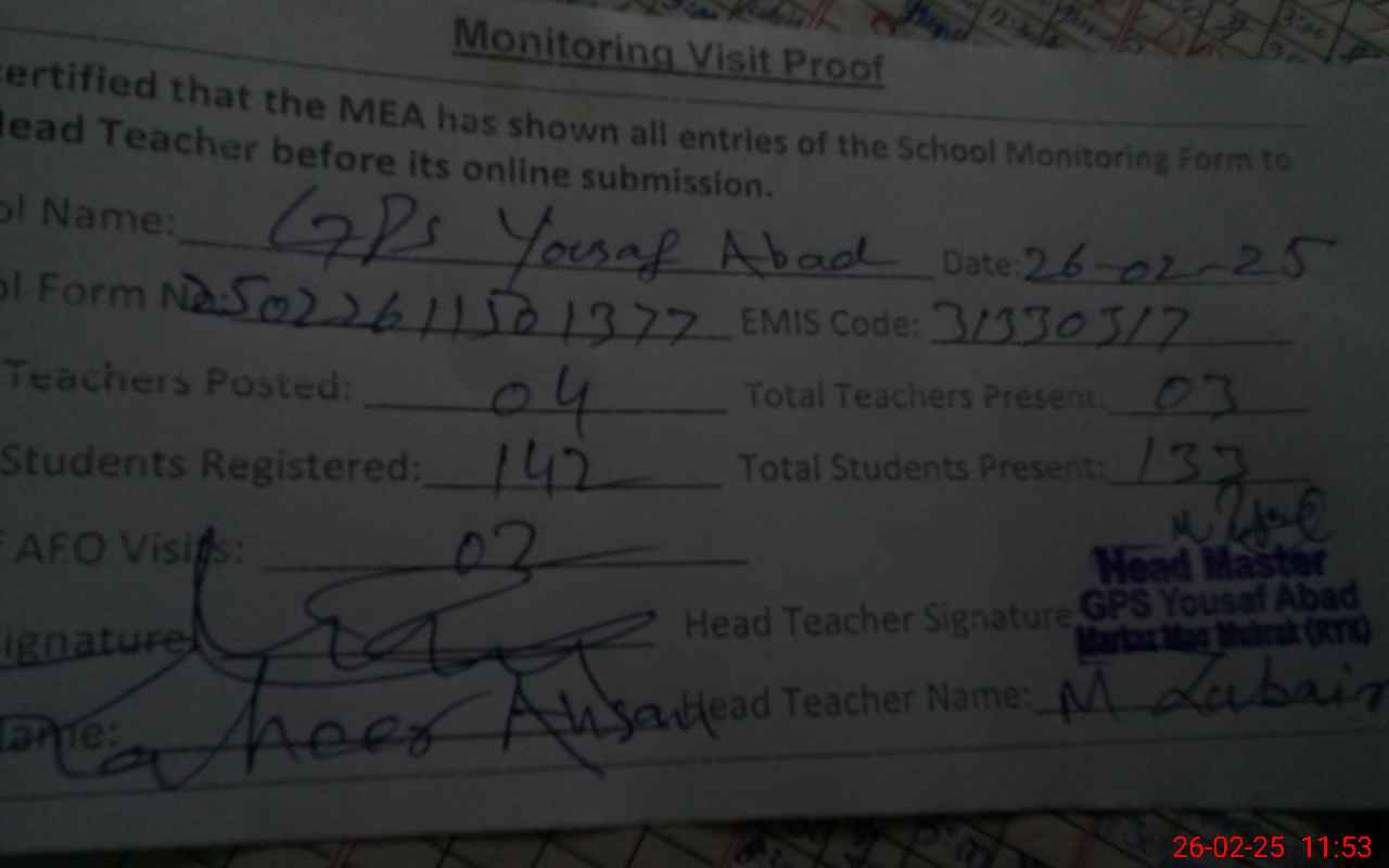 | Attendance Register | Head Teacher | MEA with School | Visit Proof |