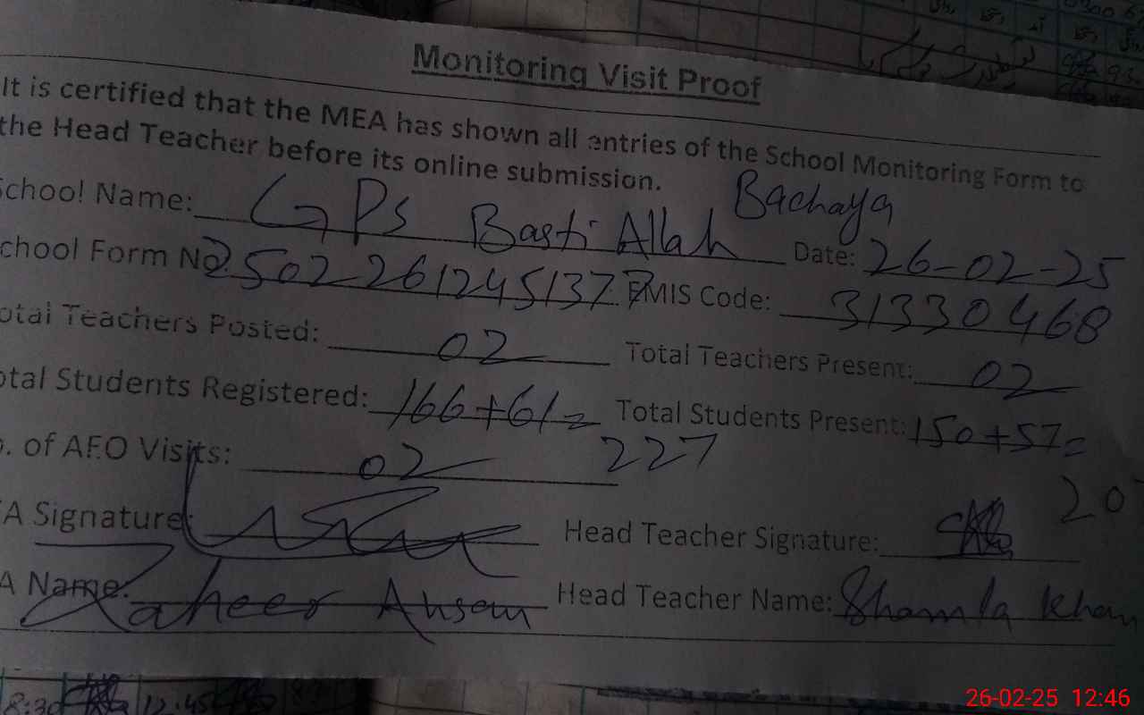 | EMIS Code: 31330468 | Name of School: GPS BASTI ALLAH BACHAYA | |||