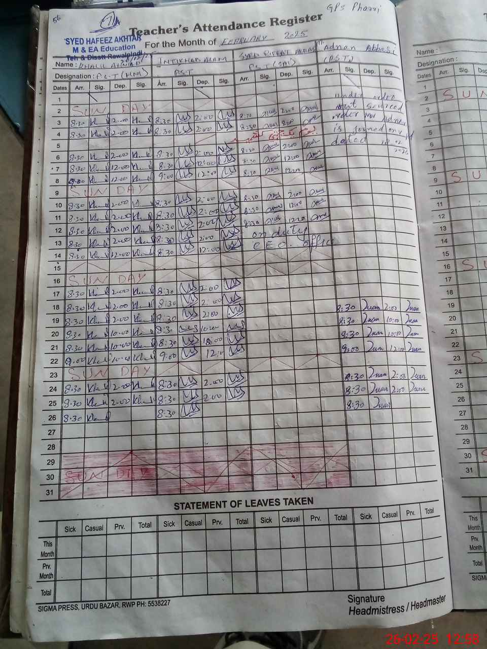 | Name: Kh**** Ah**** Designation: (School Headmaster's/Headmistress's) PST Phone/Cell Number: 03**** |