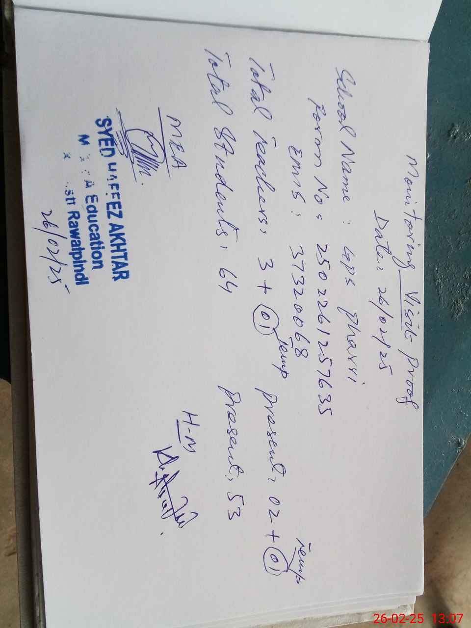 | Certified that this School was Inspected by the Undersigned MEA/DMO Today and the Information Stated Above is as Per Record. | |||||