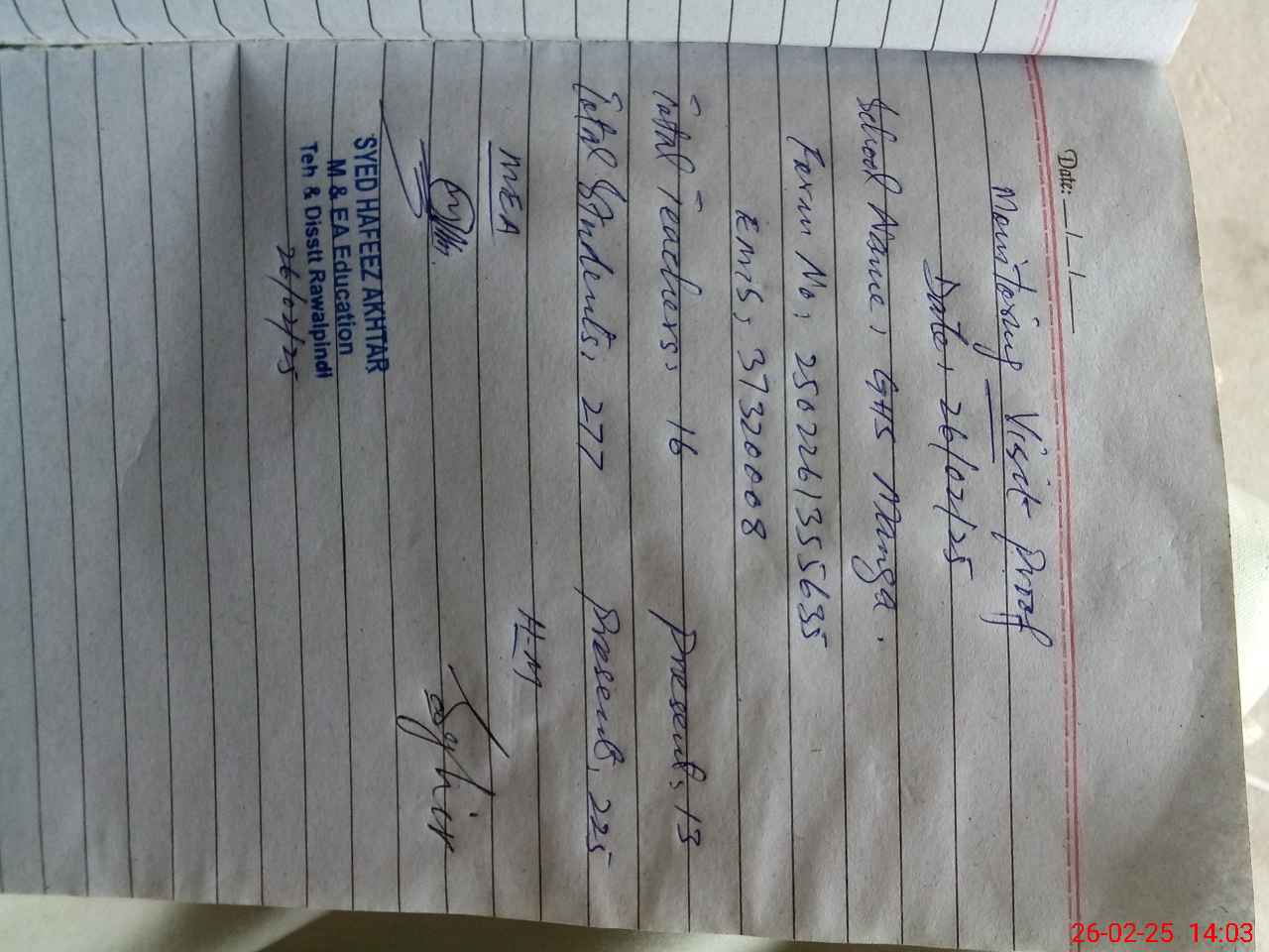 | Monitoring Date: 26-02-2025 | Start Time: 26-02-2025 01:28 PM | End Time: 26-02-2025 02:06 PM | Name of MEA: Sy**** Ha**** Ak**** | |