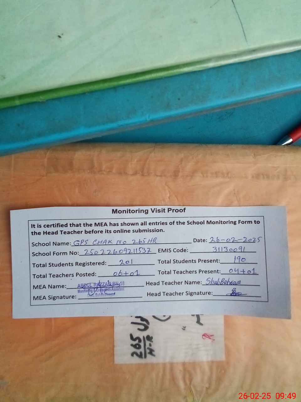 | Attendance Register | Head Teacher | MEA with School | Visit Proof |