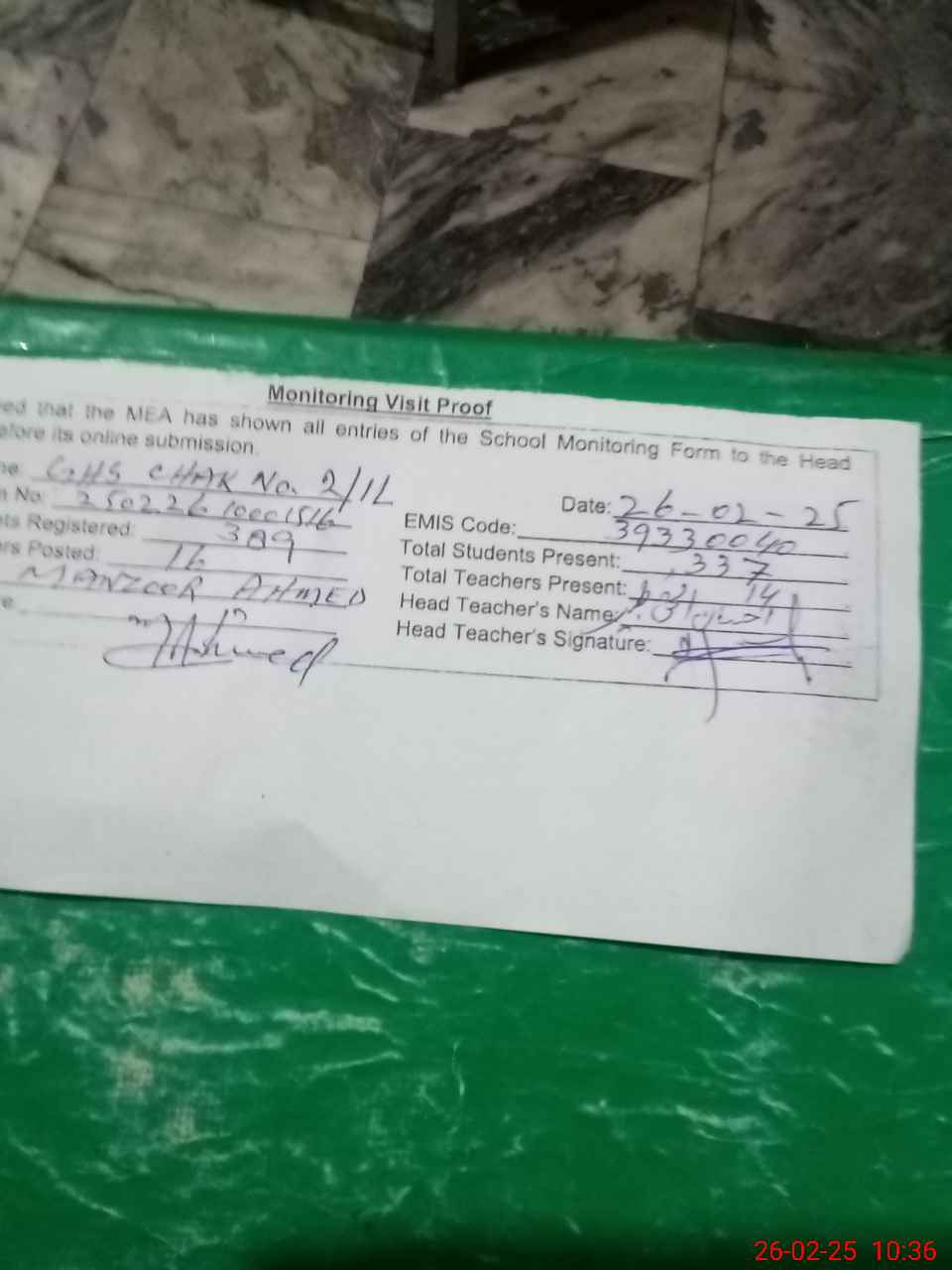 | Attendance Register | Head Teacher | MEA with School | Visit Proof |