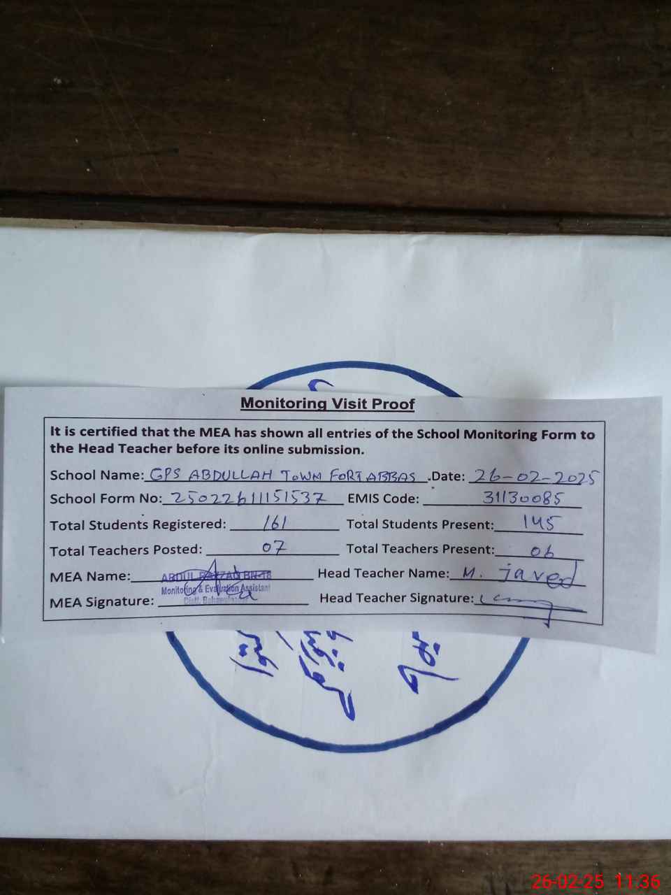 | EMIS Code: 31130085 | Name of School: GPS ADBULLAH TOWN FOR ABBAS | |||