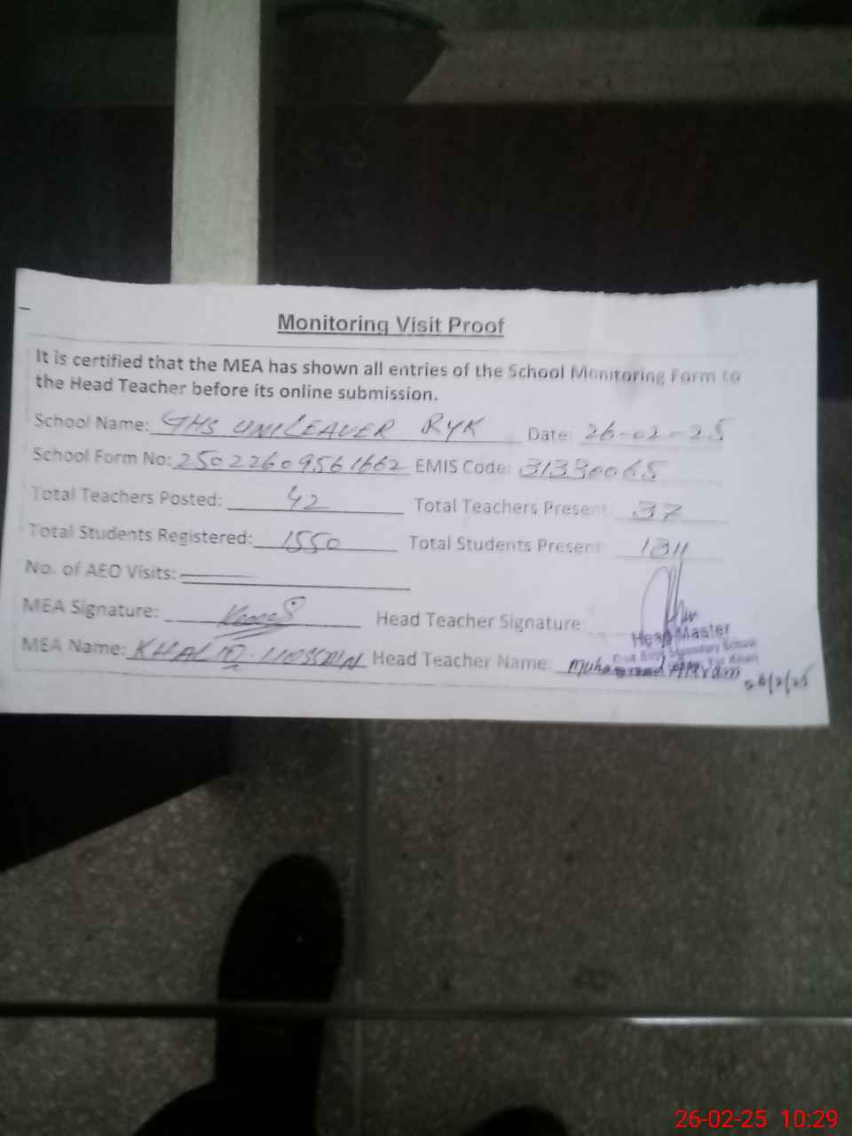| EMIS Code: 31330065 | Name of School: GHS UNILEVER R.Y.KHAN | |||