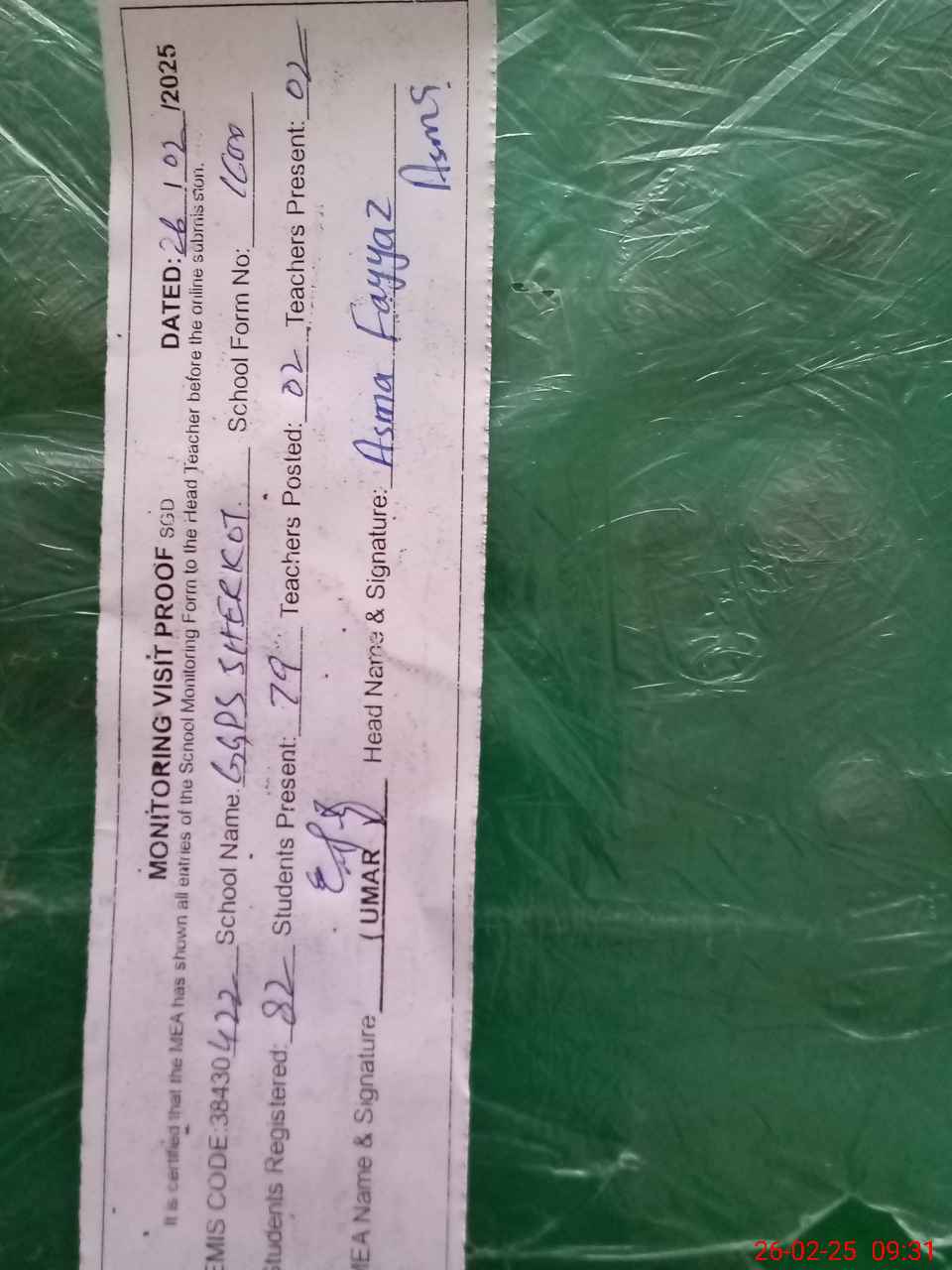 | Attendance Register | Head Teacher | MEA with School | Visit Proof |