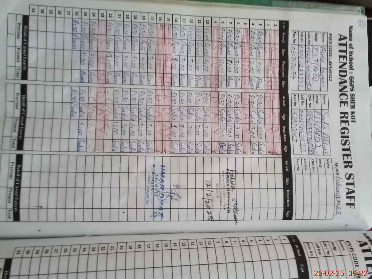| Name: AS**** FA**** Designation: (School Headmaster's/Headmistress's) PST Phone/Cell Number: 03**** |