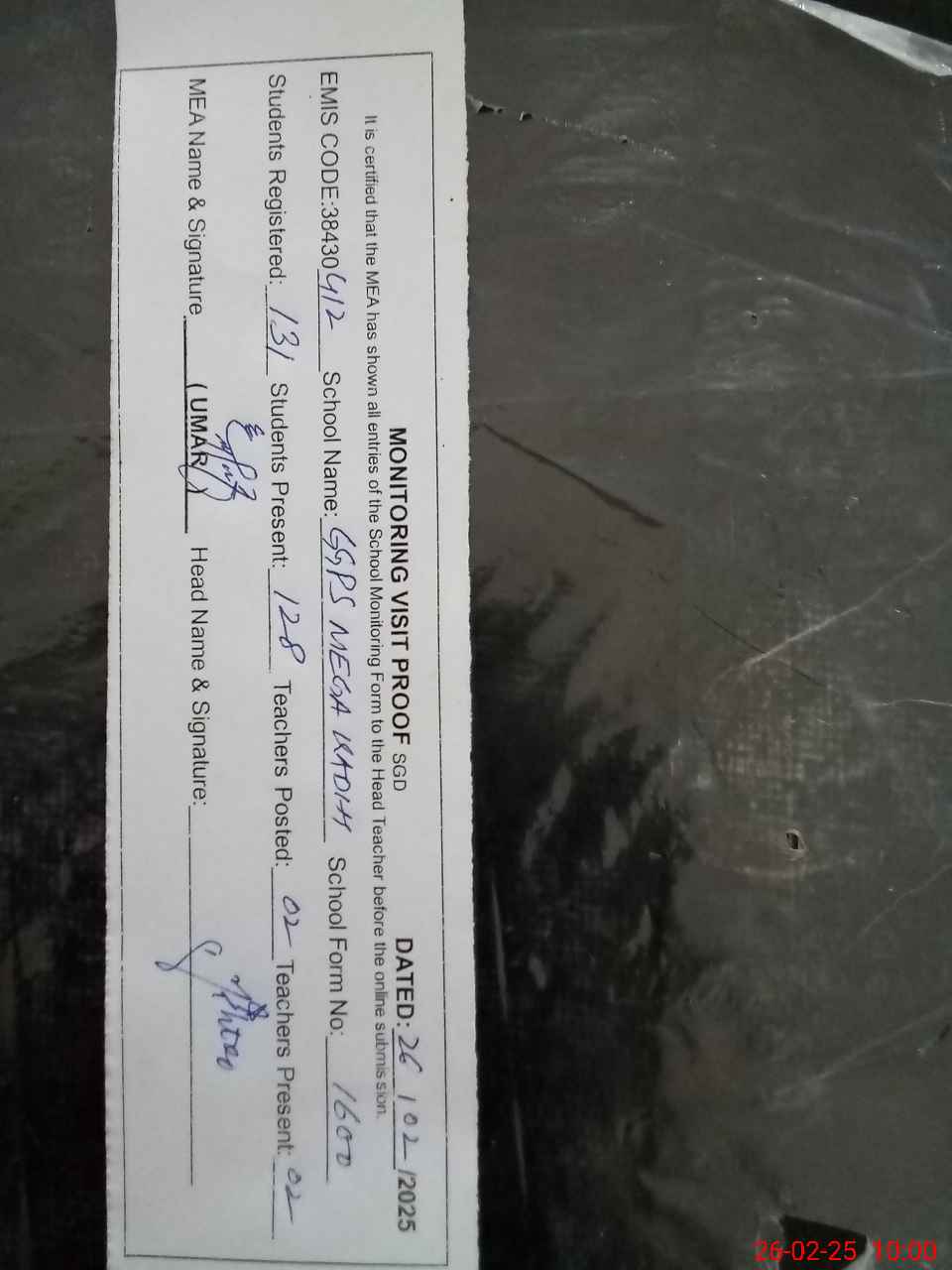 | Attendance Register | Head Teacher | MEA with School | Visit Proof |
