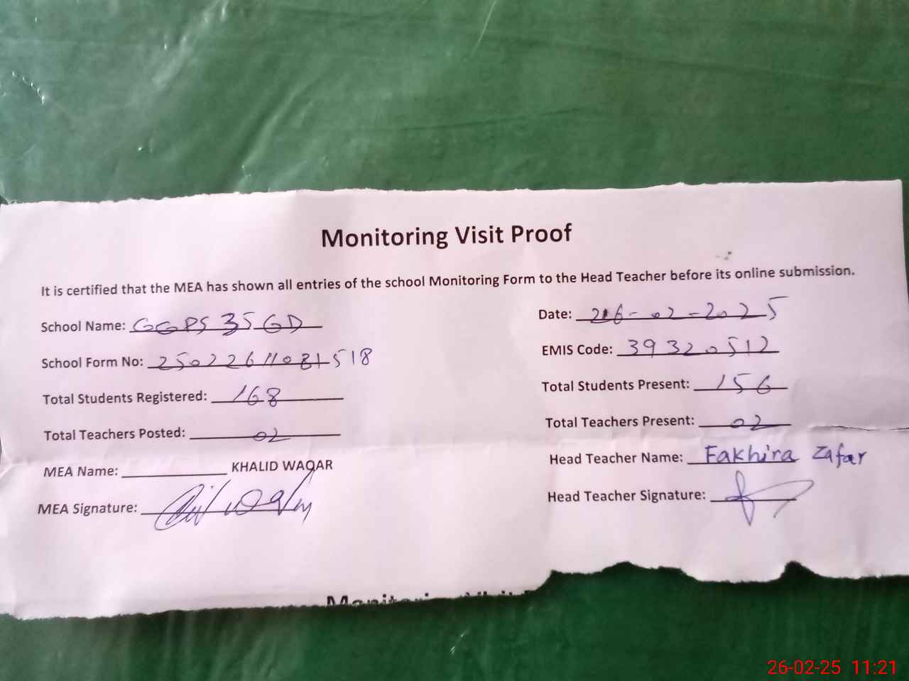 | Attendance Register | Head Teacher | MEA with School | Visit Proof |