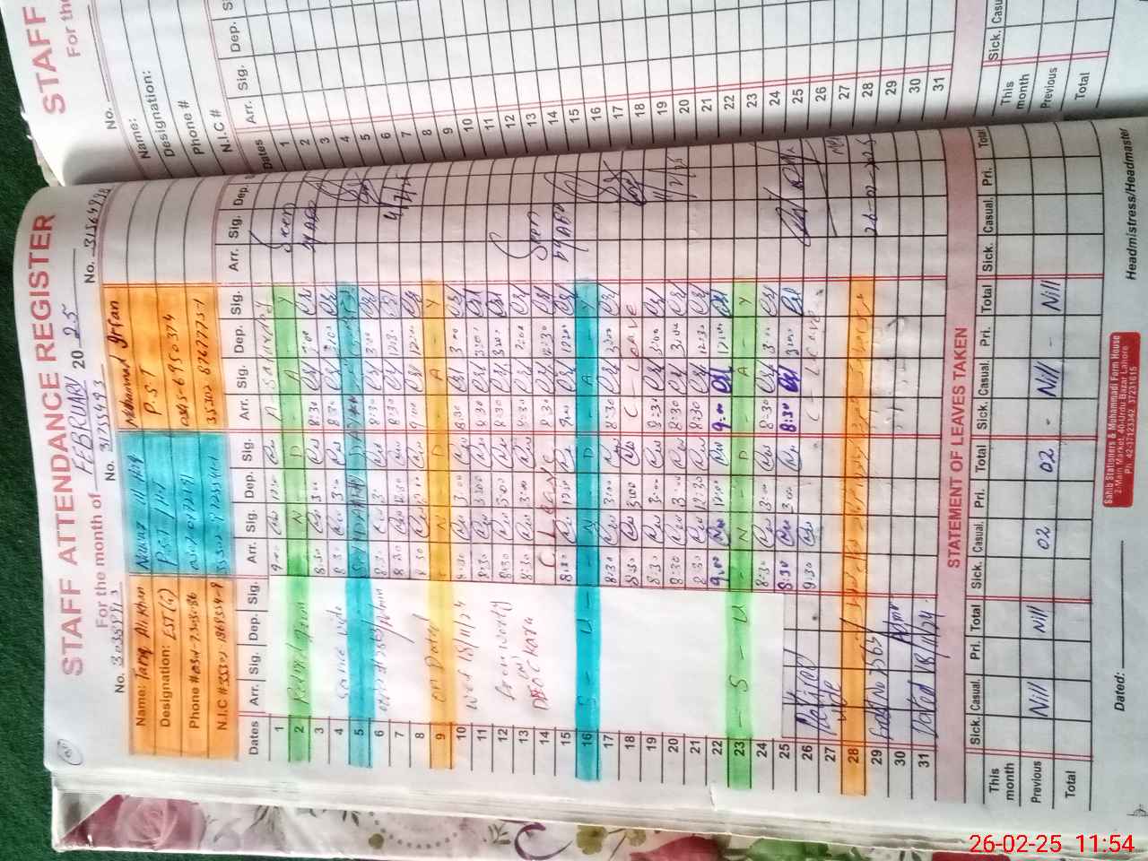 | Name: Ta**** Al**** Designation: (School Headmaster's/Headmistress's) PTC/JV Phone/Cell Number: 03**** |