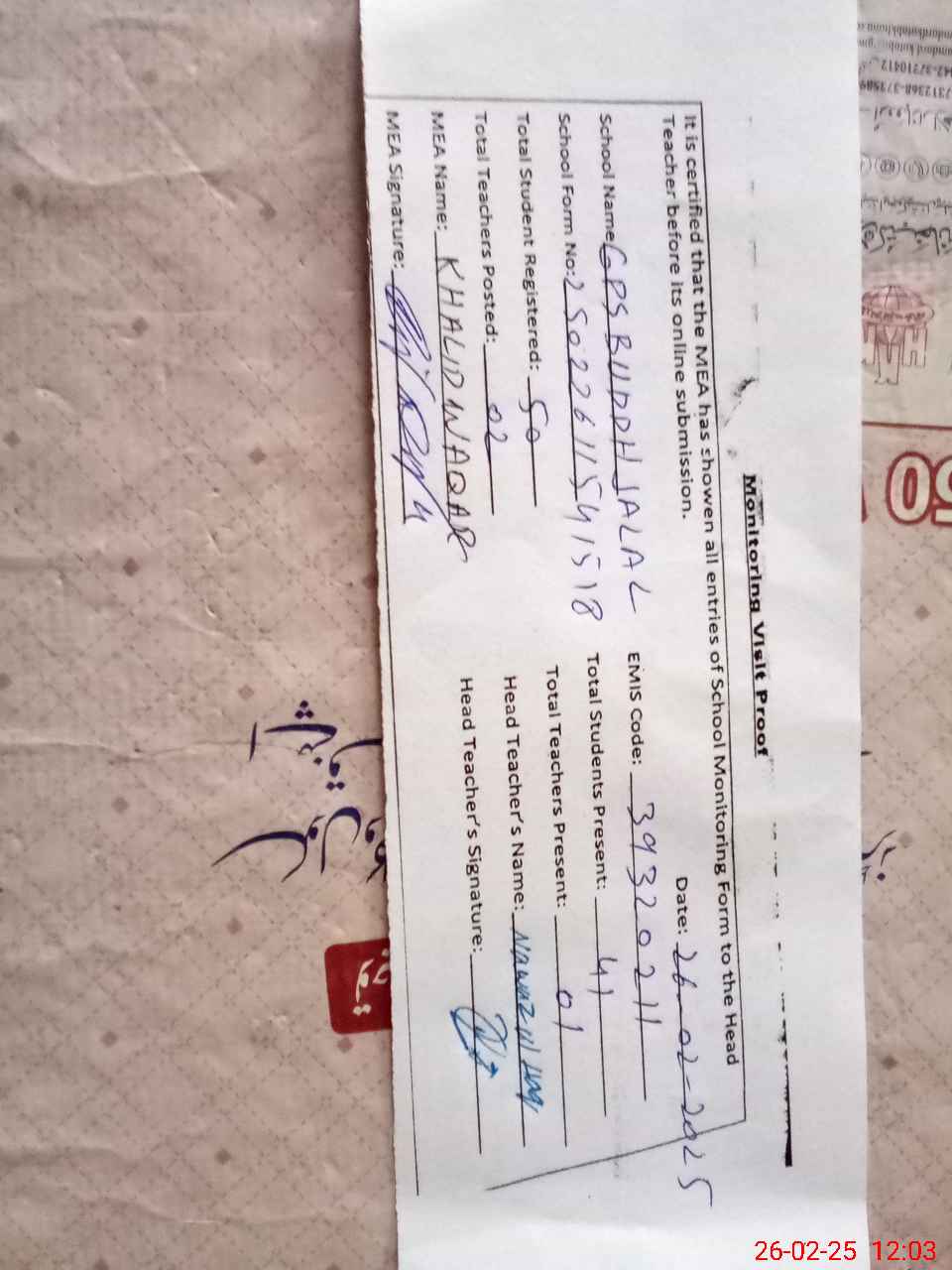 | Certified that this School was Inspected by the Undersigned MEA/DMO Today and the Information Stated Above is as Per Record. | |||||