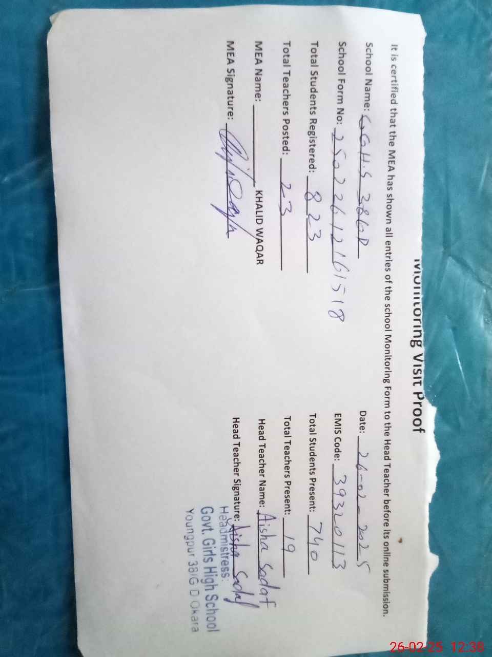 | Attendance Register | Head Teacher | MEA with School | Visit Proof |