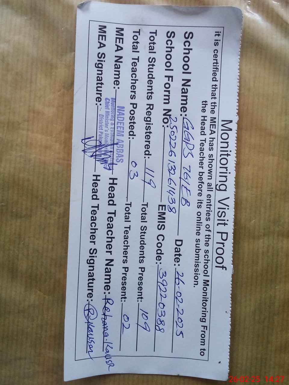 | Attendance Register | Head Teacher | MEA with School | Visit Proof |
