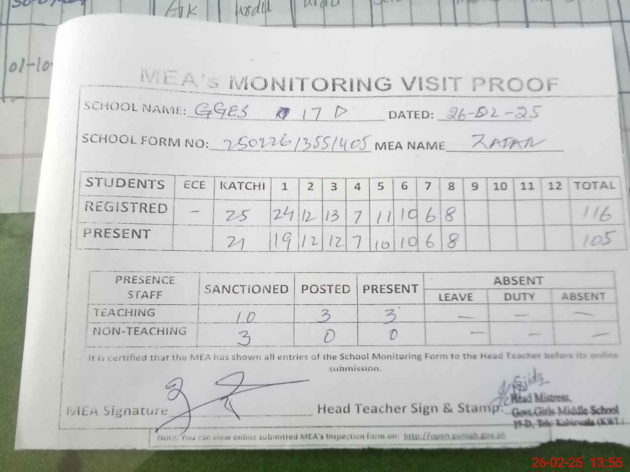 | Attendance Register | Head Teacher | MEA with School | Visit Proof |