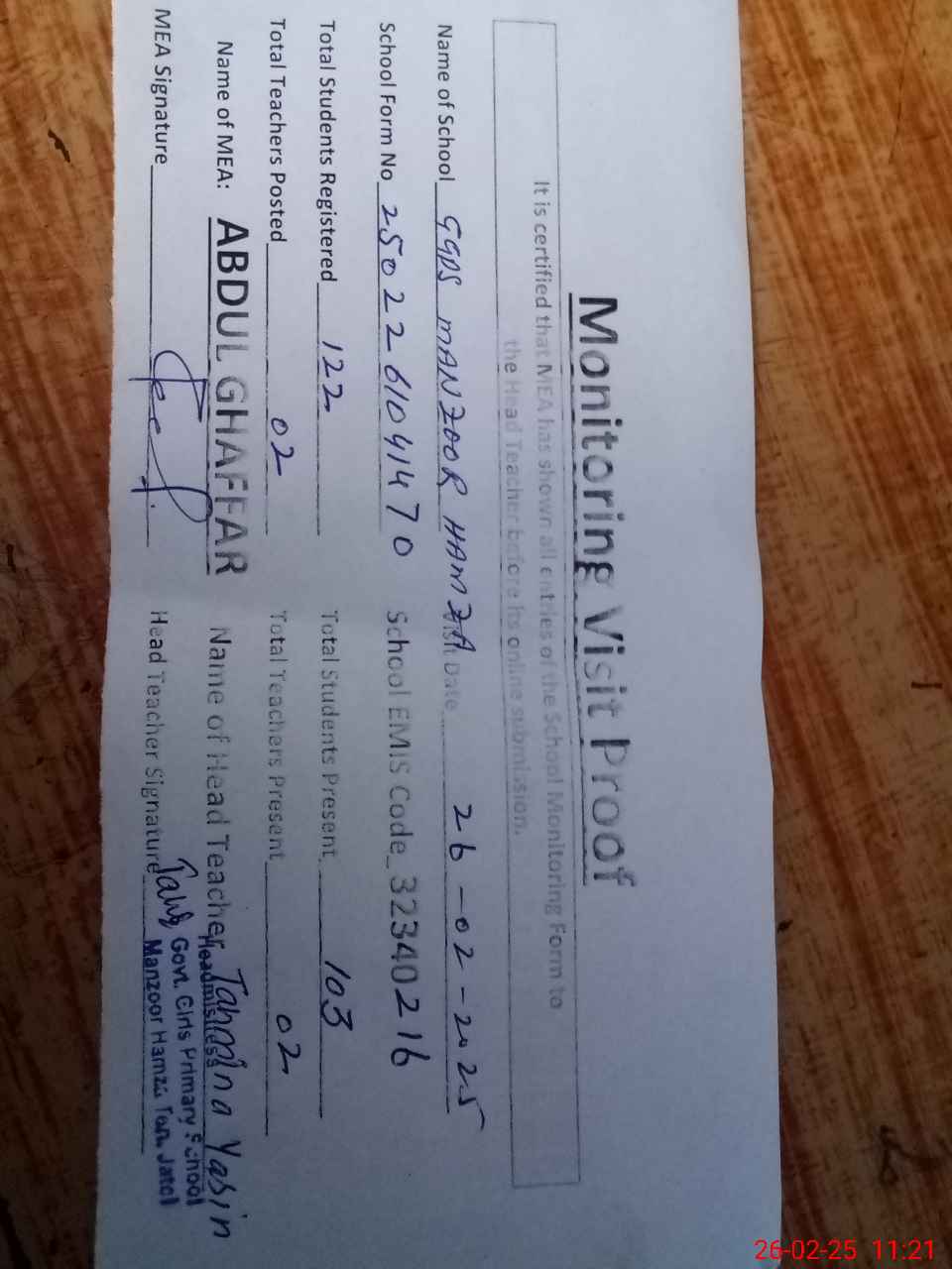 | Attendance Register | Head Teacher | MEA with School | Visit Proof |