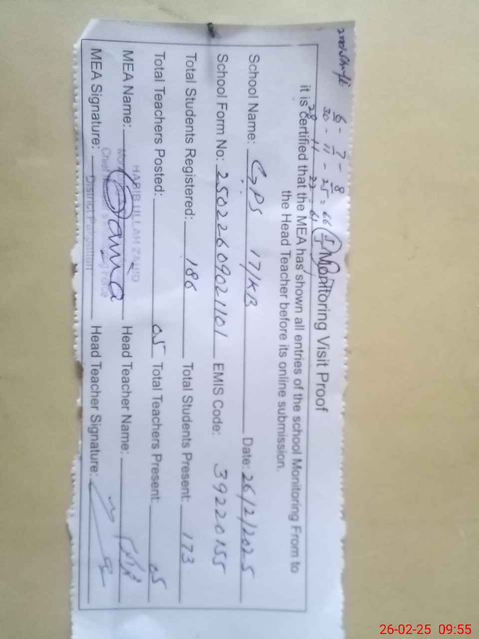 | Certified that this School was Inspected by the Undersigned MEA/DMO Today and the Information Stated Above is as Per Record. | |||||