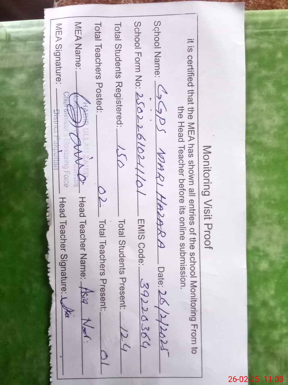 | Attendance Register | Head Teacher | MEA with School | Visit Proof |