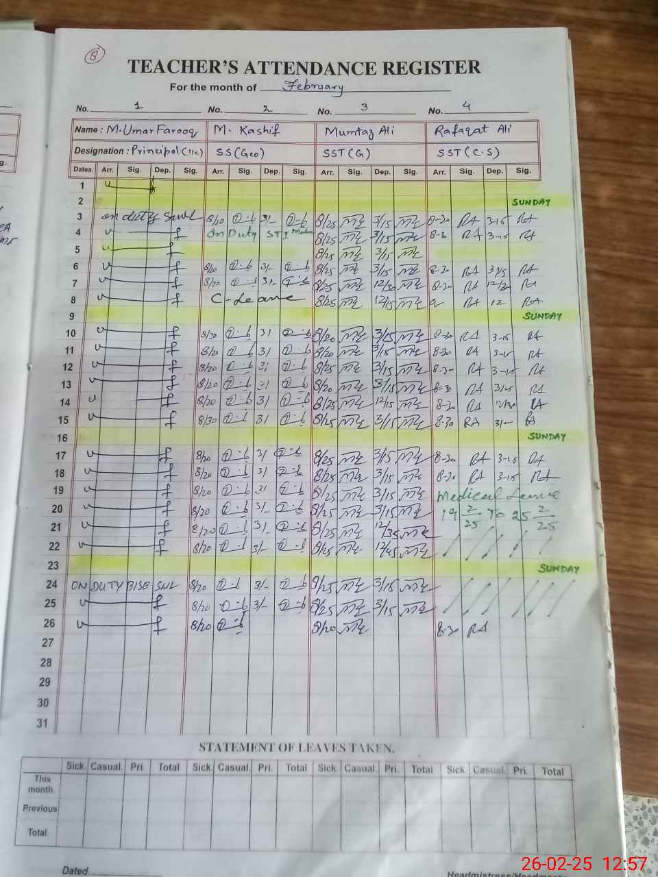 | Leave | Duty | Absent | Maternity | Medical | Ex- Pak |
