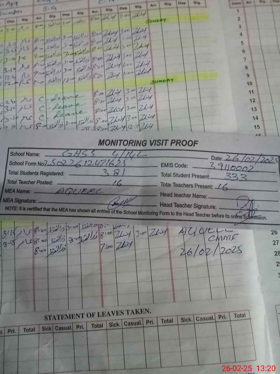 | Attendance Register | Head Teacher | MEA with School | Visit Proof |