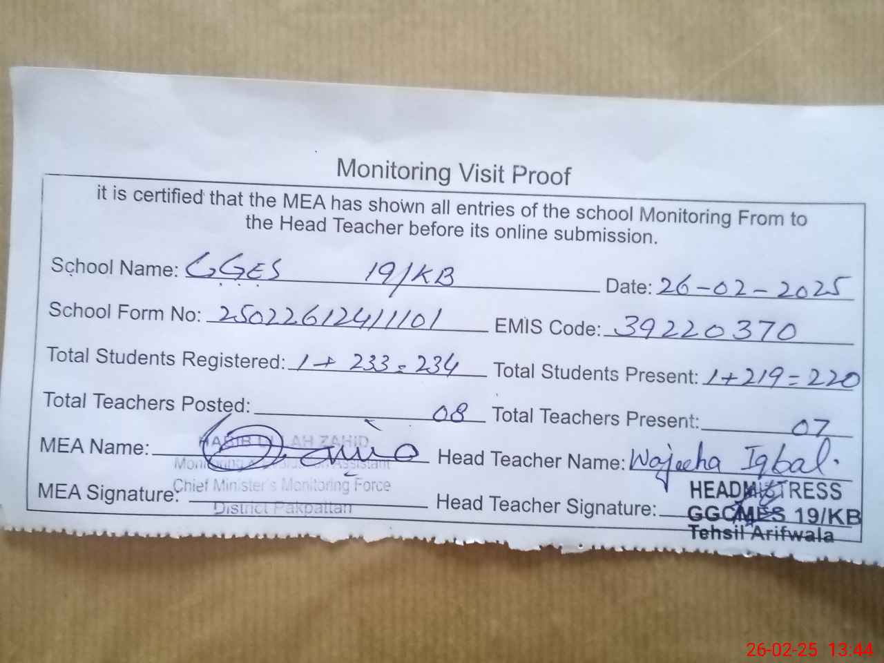 | EMIS Code: 39220370 | Name of School: GGCMES CHAK NO 19 KB | |||
