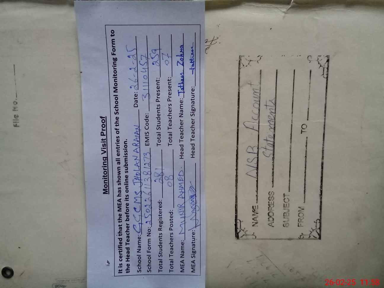 | EMIS Code: 31110457 | Name of School: GGES JHOLAN ARAIAN | |||