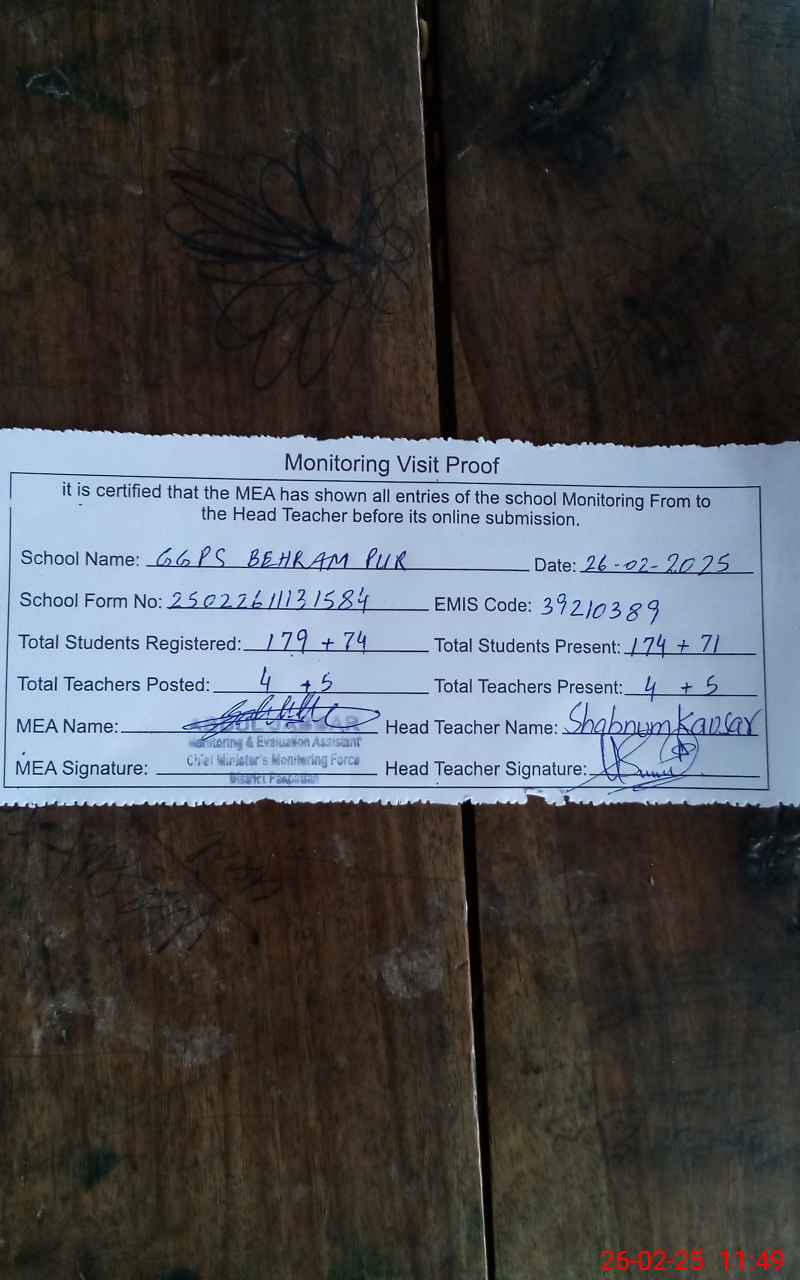 | EMIS Code: 39210389 | Name of School: GGPS BEHRAM PUR | |||