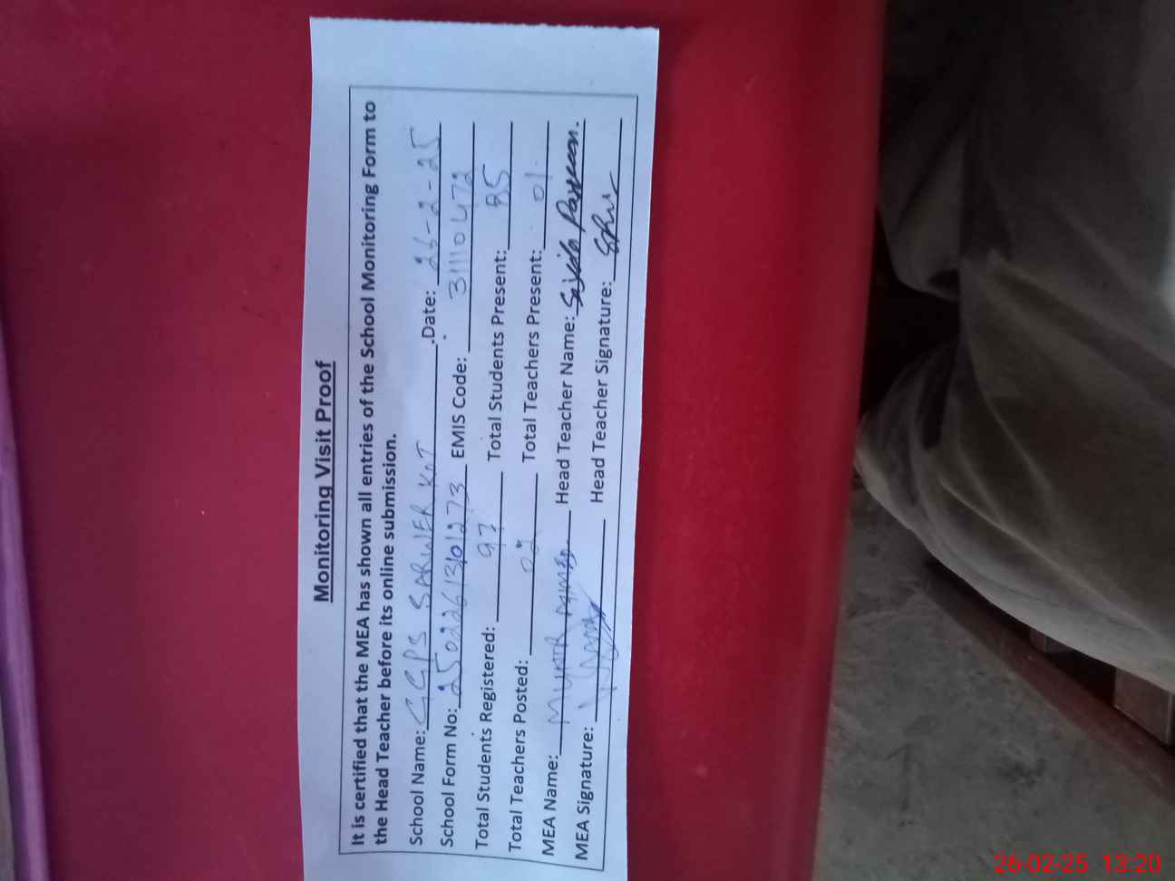 | Attendance Register | Head Teacher | MEA with School | Visit Proof |