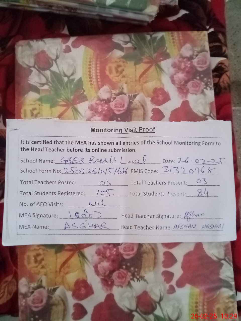 | Attendance Register | Head Teacher | MEA with School | Visit Proof |