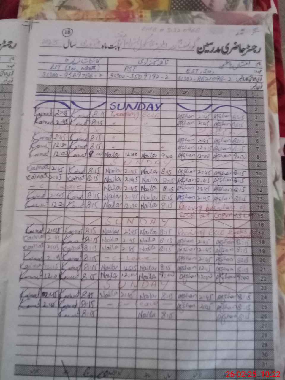 | CNIC | Full Name | Designation | R/C | Absence During Last Calender Month |