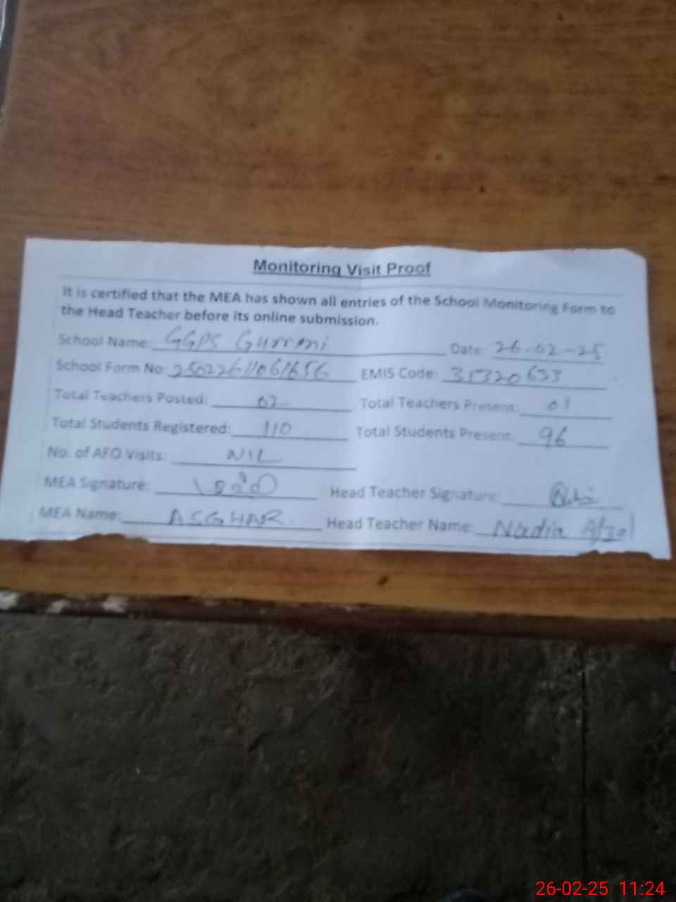| Attendance Register | Head Teacher | MEA with School | Visit Proof |