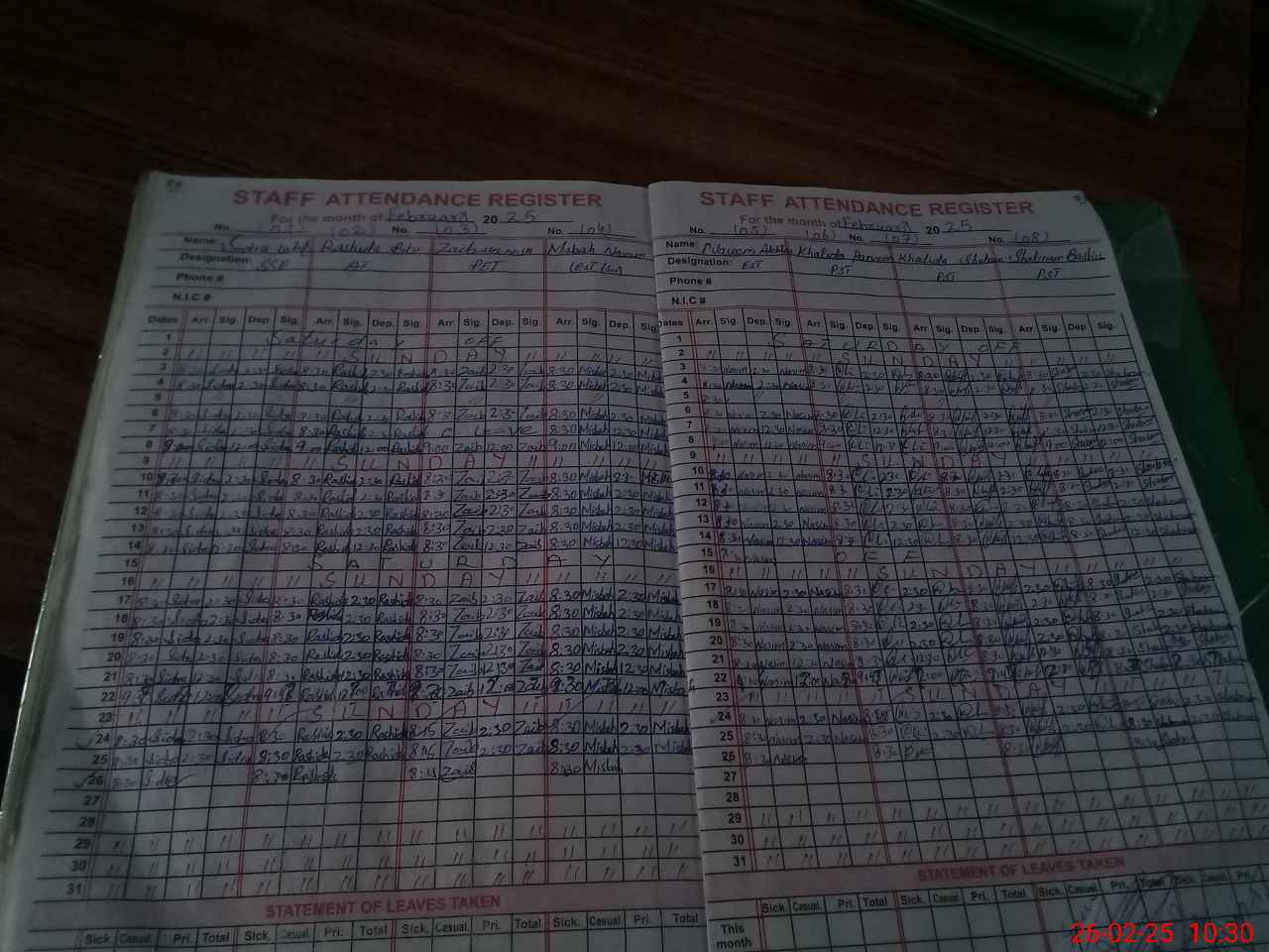 | CNIC | Full Name | Designation | R/C | Absence During Last Calender Month |