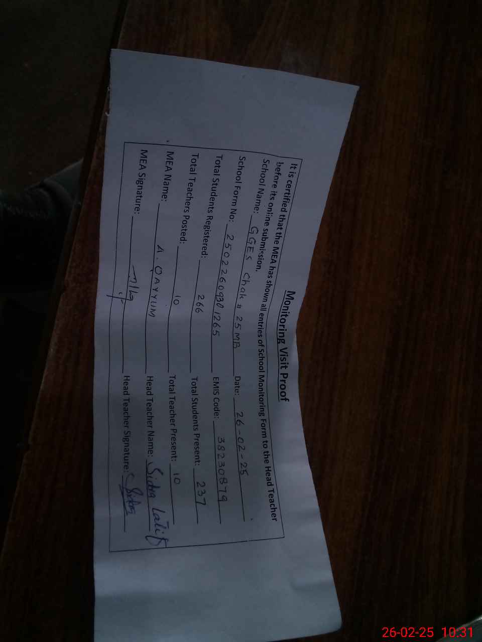 | Attendance Register | Head Teacher | MEA with School | Visit Proof |