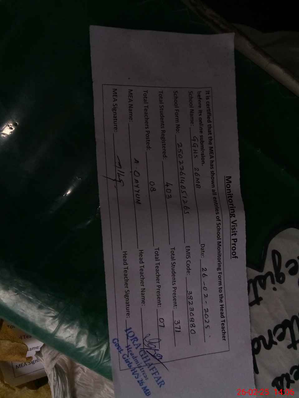 | Attendance Register | Head Teacher | MEA with School | Visit Proof |